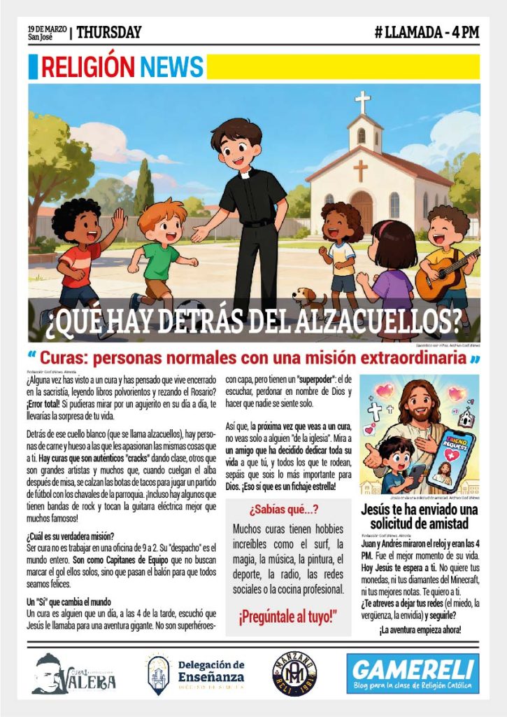 Los alumnos de 3º a 6º se convierten en reporteros de la fe con nuestro periódico exclusivo. Analizamos el «hackeo» al reloj, la vida real de los sacerdotes (¡más allá del alzacuellos!) y la invitación de Jesús en el recreo.