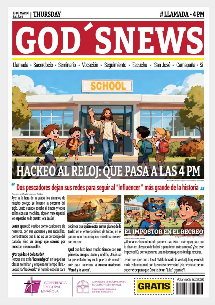 Con motivo de la festividad de san José y la campaña del Día del Seminario 2026, lanzamos un despliegue de materiales originales y gamificados para trabajar la vocación sacerdotal en el aula de Religión. Bajo el lema «Deja tus redes… y sígueme», nos unimos a la iniciativa de la Conferencia Episcopal Española (Comisión de Clero y Seminarios) para descubrir qué ocurre a esa «hora mágica»: las 4 PM.